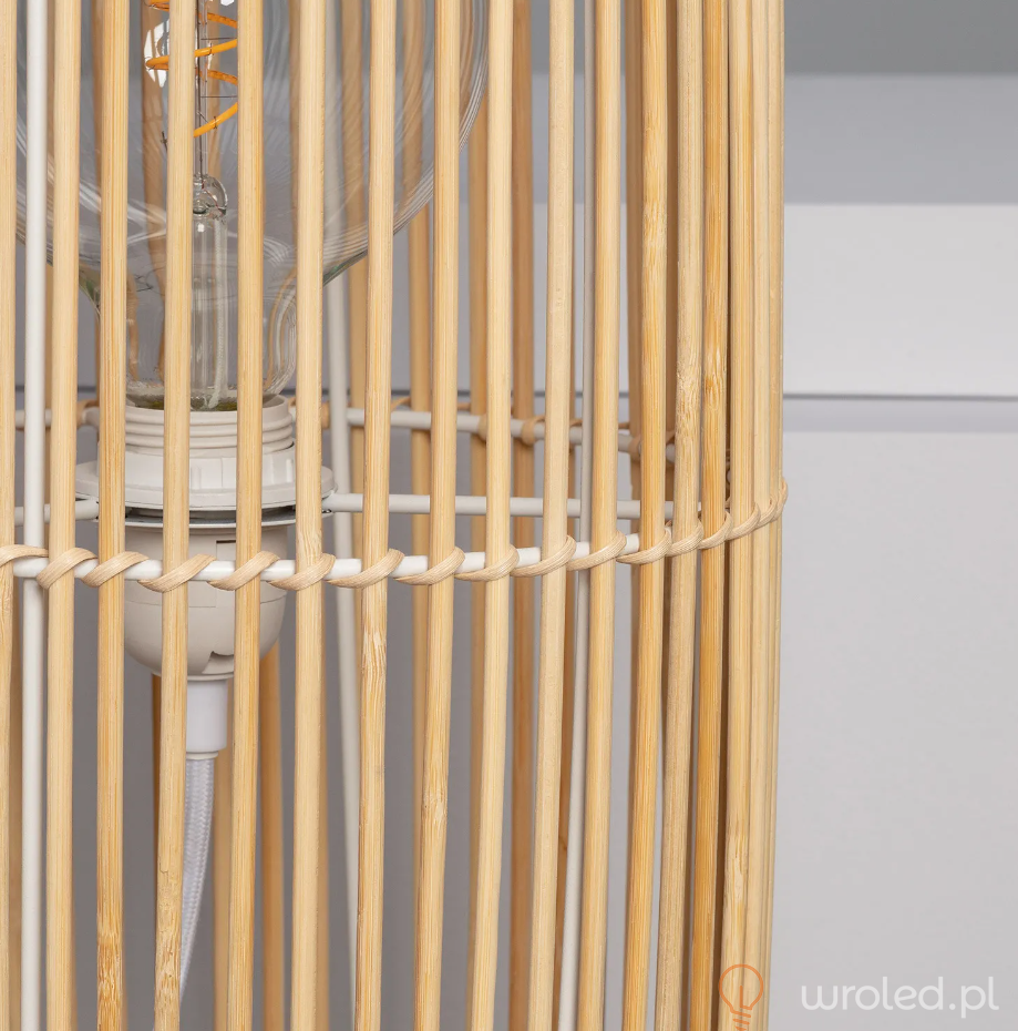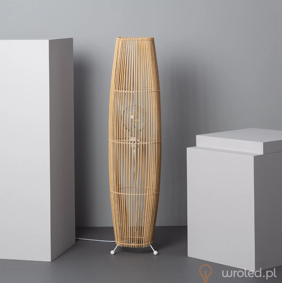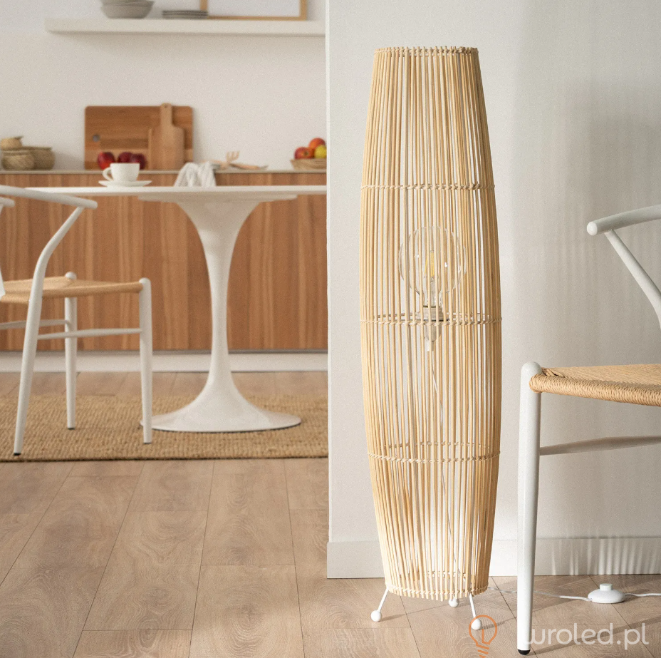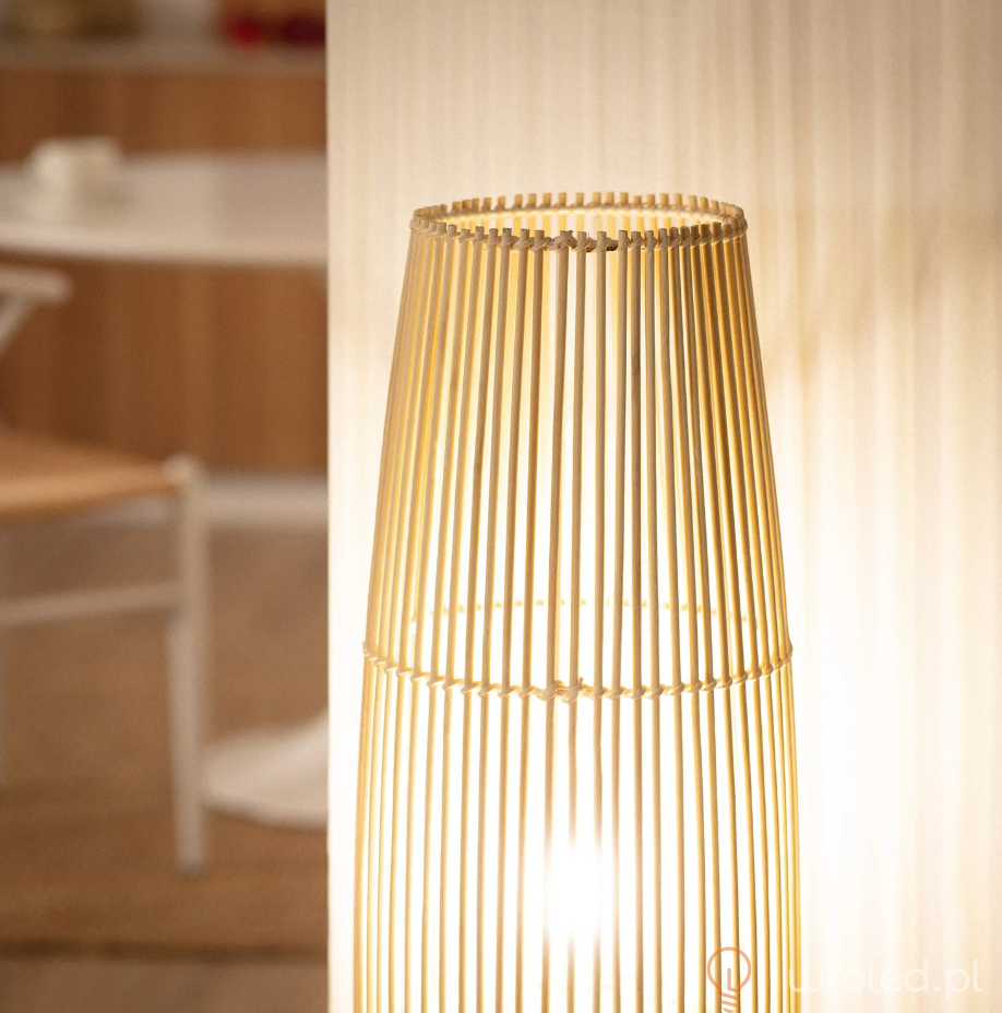Lampa podłogowa Kom jest doskonałym elementem nadającym dekoracyjny charakter każdej przestrzeni. Wykonana z bambusa, który w połączeniu z jej minimalistycznym designem prezentuje nowoczesny wygląd, ale który doskonale połączy się z dekoracją każdej przestrzeni, niezależnie od jej stylu. Jasność lampy podłogowej będzie zależała od żarówki z trzonkiem E27, której użyjemy. Otwiera to szeroki wachlarz możliwości, ponieważ np. możemy użyć żarówek, nadając im bardziej retro wygląd, lub użyć żarówki o bardziej nowoczesnym wyglądzie. Ważne jest, aby wybrać żarówkę, która odpowiednio oświetla przestrzeń, biorąc pod uwagę potrzeby oświetleniowe przestrzeni.