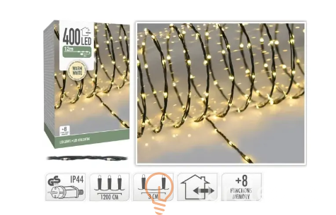Girlanda zewnętrzna Small LED o długości 12m w wersji Small stanowi doskonały dodatek do ozdabiania przestrzeni świątecznych. Ta czarna girlanda kablowa wyposażona jest w 400 diod LED, które emitują ciepłe światło bieli. Posiada 3-metrowy kabel, umożliwiający podłączenie do gniazdka elektrycznego. Girlanda oferuje 8 różnych trybów pracy, dostępnych do wyboru poprzez naciśnięcie przycisku umieszczonego na gnieździe sieciowym. Termin „Small” odnosi się do rozmiaru diod LED.