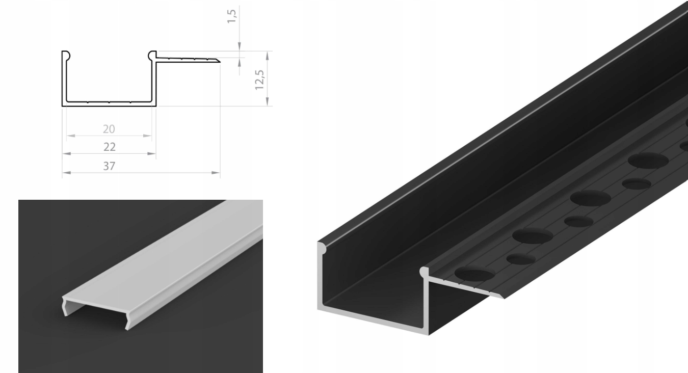 Dostępny w wielu kolorach: anodowany, biały, czarny, oraz w długościach: 2000 mm, 3000 mm. Montaż jest szybki i prosty – wystarczy użyć wkrętów meblowych. Inne kolory i długości na pozostałych Naszych aukcjach.