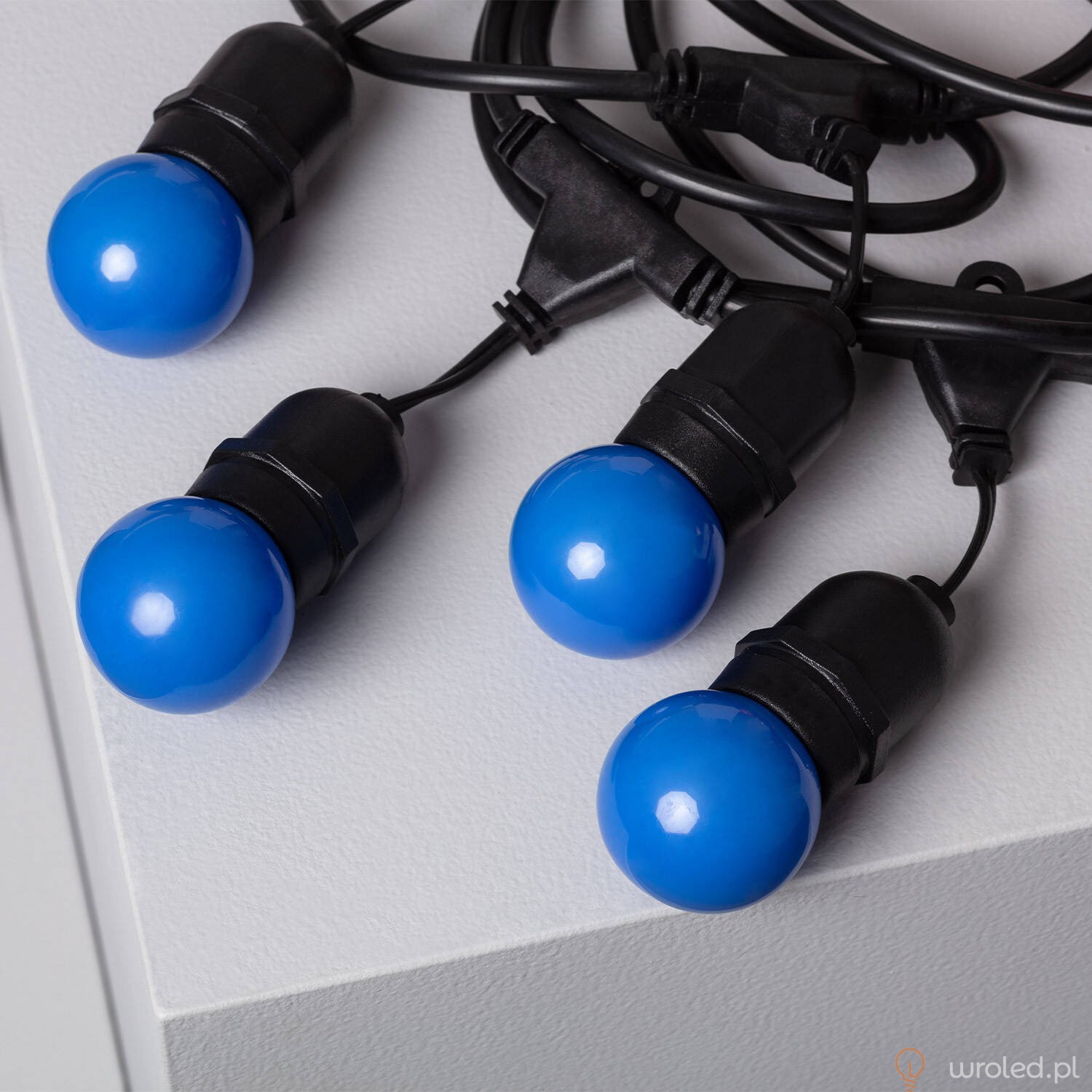 Odkryj zestaw girlandy o długości 5,5 metra z czarnym przewodem, który zawiera 8 kolorowych żarówek LED E27 G45 o mocy 3W. Idealny do tworzenia wyjątkowej atmosfery dzięki niebieskiej barwie światła.