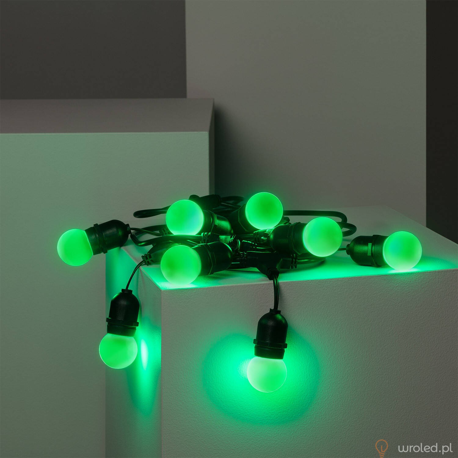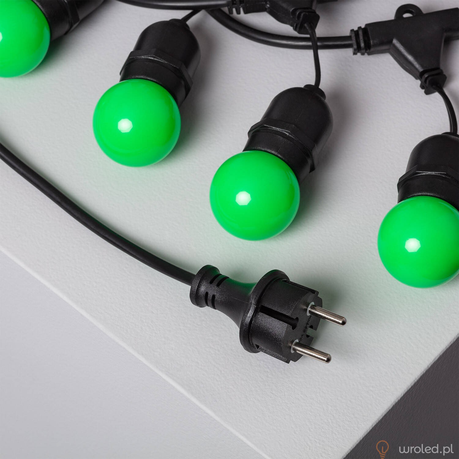 Odkryj zestaw girlandy o długości 5,5 metra, który zawiera 8 kolorowych żarówek LED E27 G45 o mocy 3W. Idealny do tworzenia wyjątkowej atmosfery dzięki zielonej barwie światła.