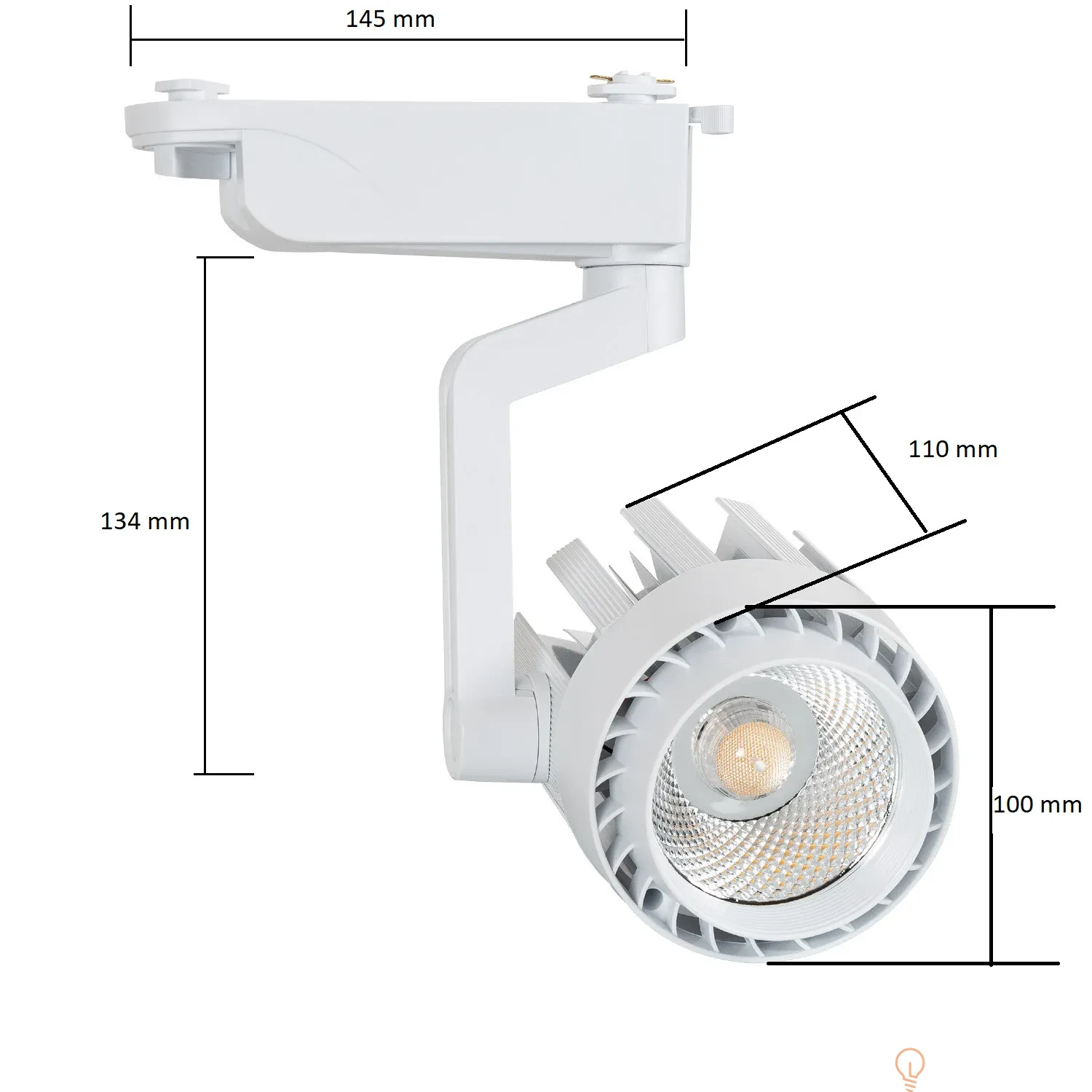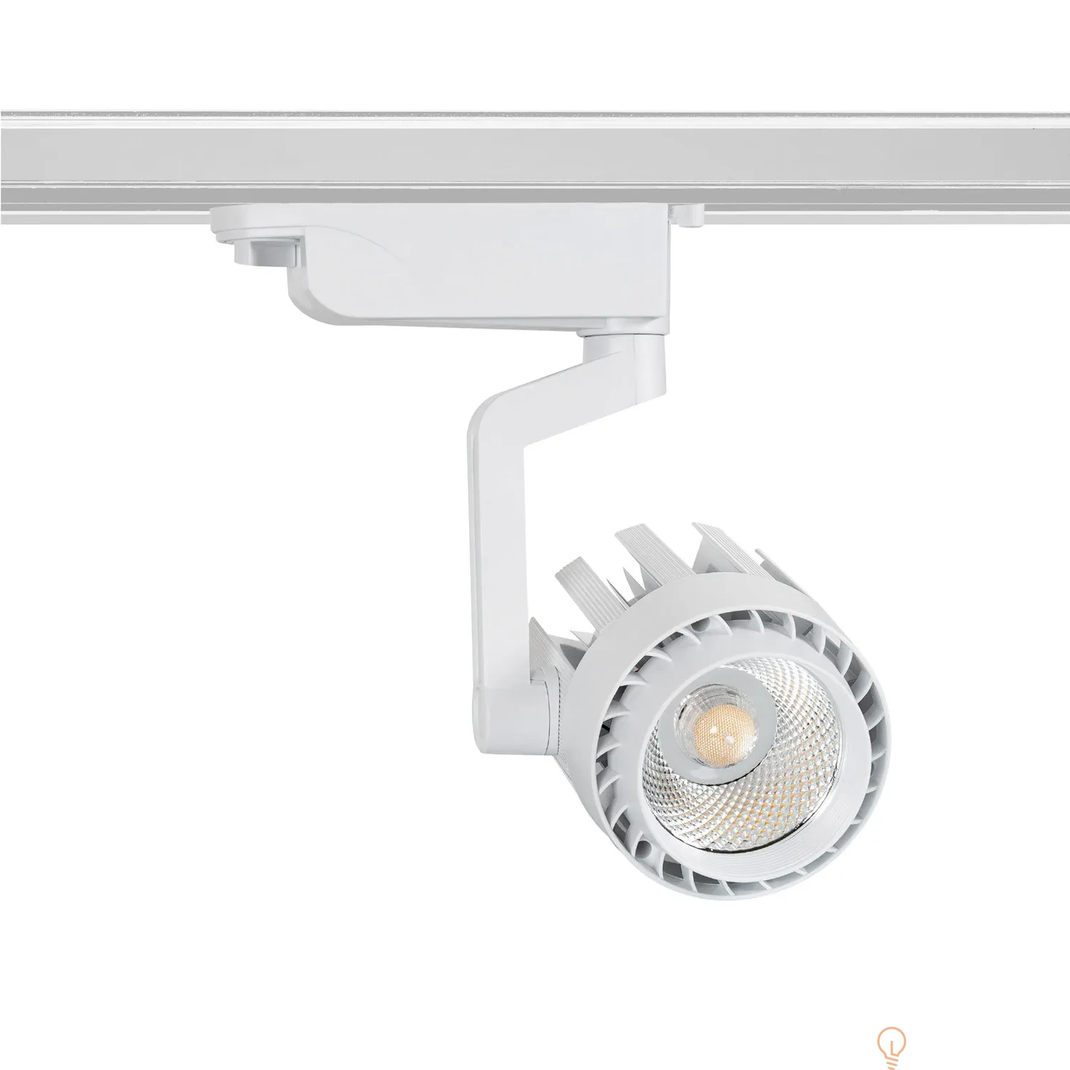 Reflektor LED 30W Biały Dora do Szyn Jednofazowych wykonany z wysokiej jakości aluminium i poliwęglanu. Integruje ona źródło światła z wysokowydajną technologią COB o wydajności 100lm/W. Zapewnia wysokiej jakości światło, które generuje bardzo naturalne odwzorowanie kolorów. Największym walorem reflektora jest niewątpliwie bardzo prosty montaż na szynie, a także możliwość ustawienia punktu padania światła. Jego prosty, a zarazem nowoczesny design sprawia, że odnajdzie swoje zastosowanie zarówno w obiektach komercyjnych, jak i wnętrzach zaciszu domowego. W pomieszczeniach, gdzie aktywność jest prowadzona przez wiele godzin, oświetlenie LED przynosi znaczne oszczędności w zakresie zużycia energii i pomaga zminimalizować koszty konserwacji.