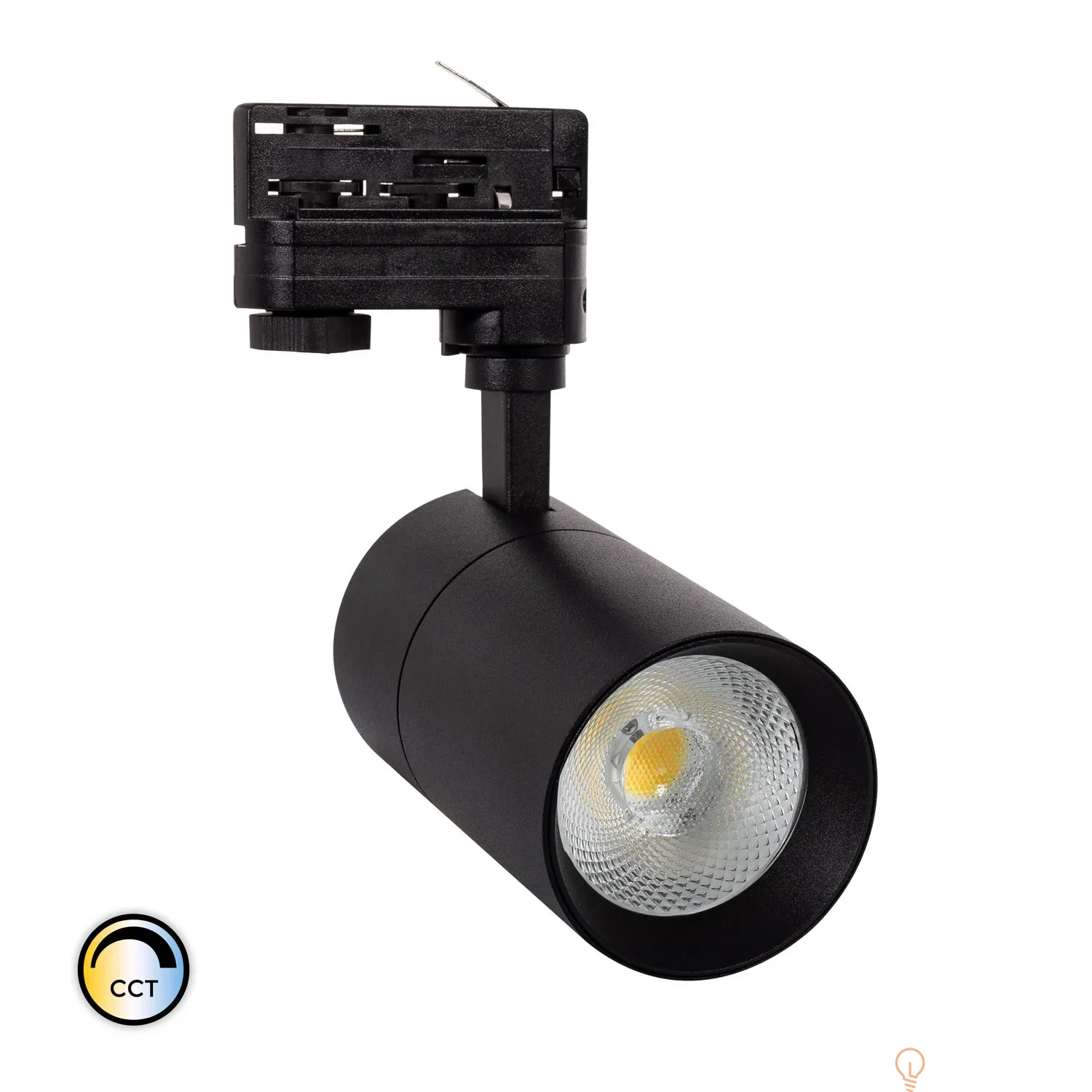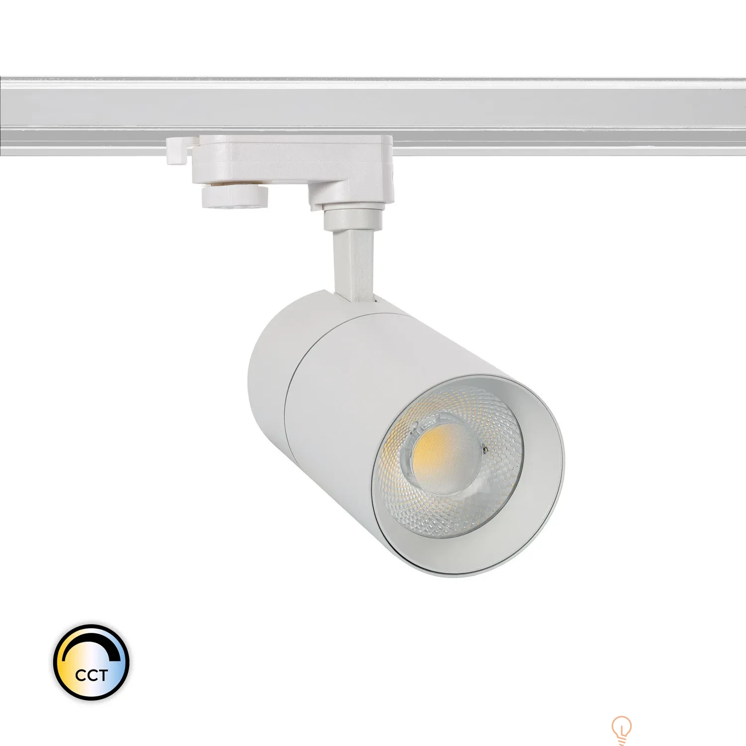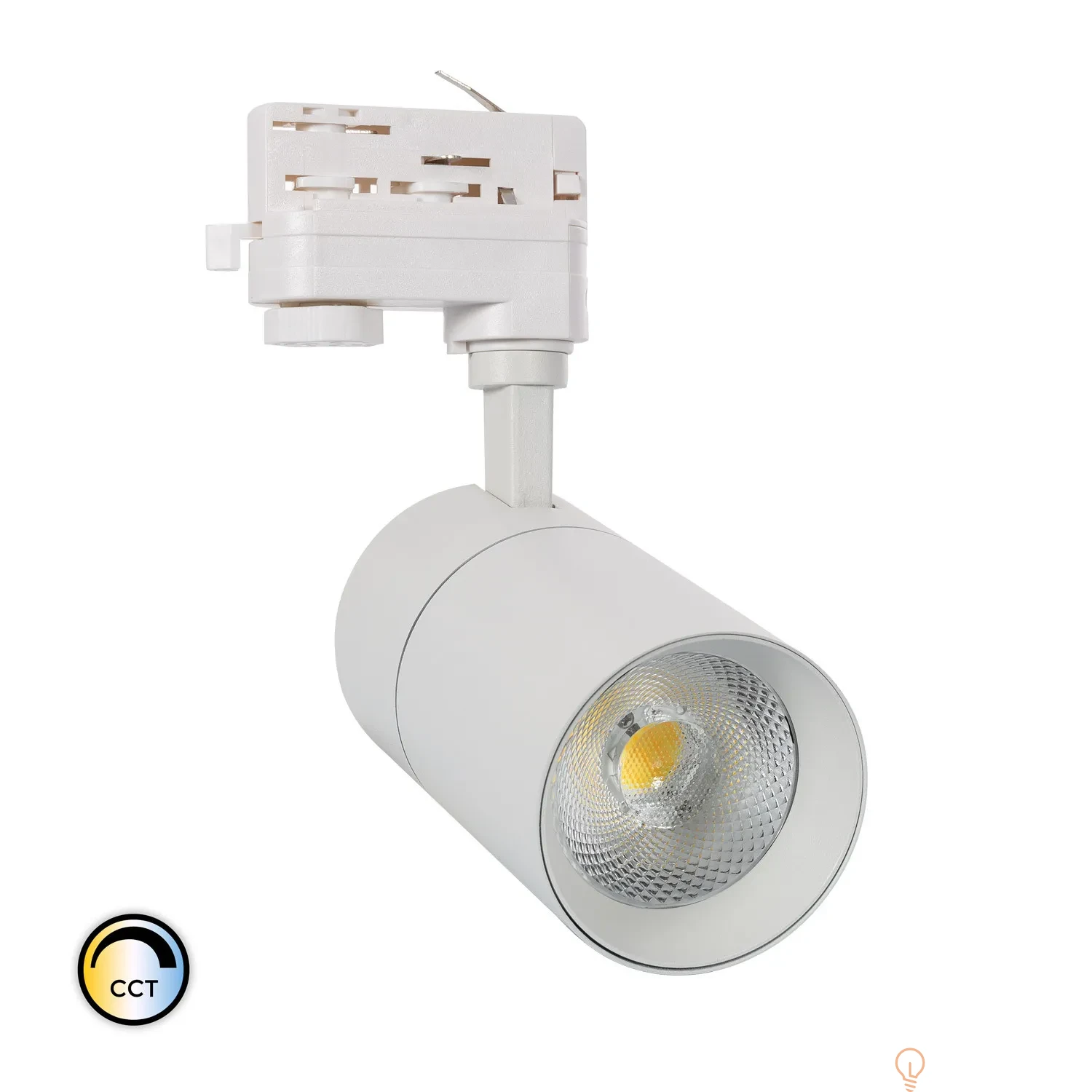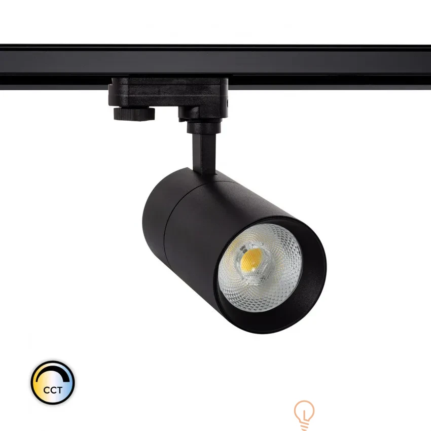 Reflektor LED Ściemnialny CCT do Wyboru New Mallet 30W do Szyn Trójfazowych wykonany z wysokiej jakości aluminium, odpornego na zmiany temperatury od -25ºC do 45ºC. Integruje ona źródło światła z wysokowydajną technologią COB i zapewnia jasność rozproszoną pod kątem 36º. Wysokiej jakości światło, które generuje bardzo naturalne odwzorowanie kolorów. Największym walorem reflektora jest niewątpliwie bardzo prosty montaż na szynie, a także możliwość ustawienia punktu padania światła w dowolnym kierunku. Jego prosty, a zarazem nowoczesny design sprawia, że odnajdzie swoje zastosowanie zarówno w obiektach komercyjnych, jak i wnętrzach zaciszu domowego. Jest to idealne rozwiązanie, aby podkreślić konkretny element w przestrzeni przy jasnym wysokiej jakości świetle, nie rezygnując z oszczędności energii. Temperatura barwowa określa wygląd koloru białej diody LED. CCT jest zdefiniowane w stopniach Kelvina; ciepłe światło ma około 2700 K, które zmienia barwę neutralną na białą do około 4000 K i białą zimną do 5000 K lub więcej.