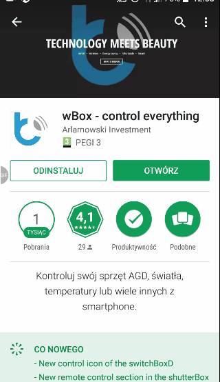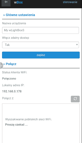 - Jeśli nasz telefon połączył się z siecią np. „wLightBoxS-534sSdasa3ds” możemy uruchomić aplikację wBox.