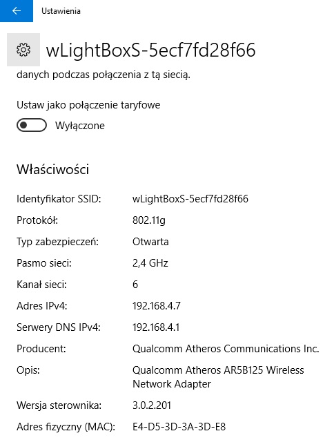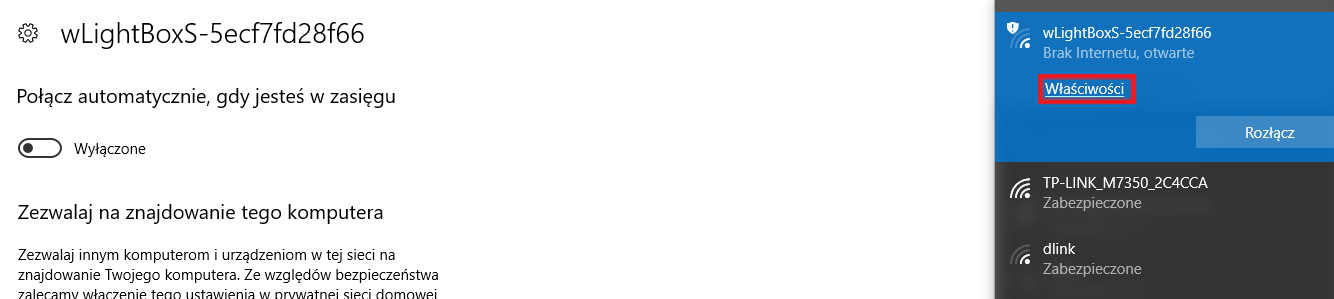 - Po połączeniu naszego komputera (pracujemy na systemie Windows 10) z siecią modułu należy wejść we „Właściwości sieci”