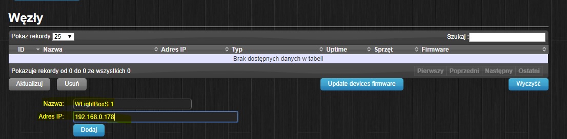 W rubryce „Nazwa” wprowadzamy własną nazwę dla modułu Blebox oraz numer IP, który wcześniej pobraliśmy z naszego routera po czym klikamy „Dodaj”