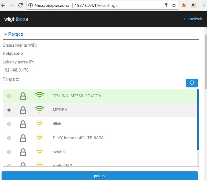 - Klikamy myszką w napis „ustawienia”, wyszukujemy swoją sieć lokalną WiFi i klikamy w przycisk „połącz” gdzie następnie wprowadzamy hasło do naszej sieci.