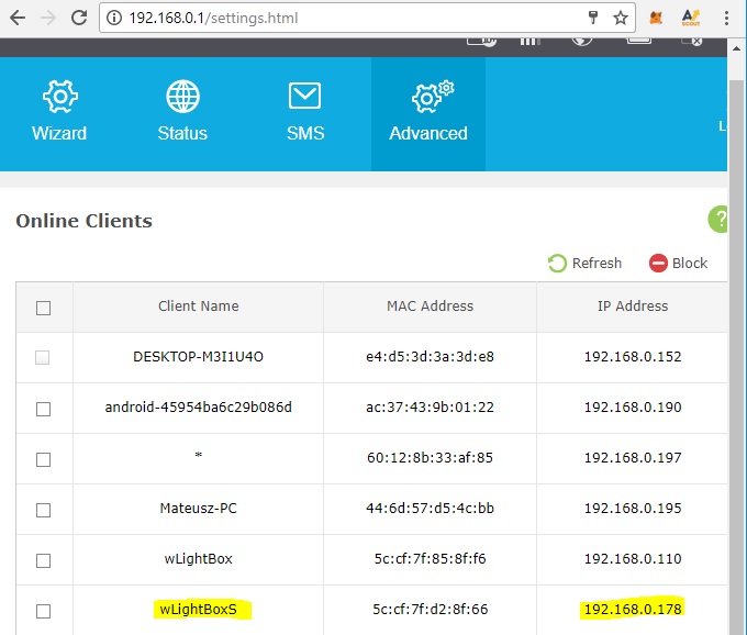- Teraz możemy połączyć nasz komputer z siecią lokalną i zalogować się do Routera gdzie znajdziemy numer IP naszego modułu Blebox. W naszym przypadku Router nadał IP dla modułu wLightBoxS „192.168.0.178”.