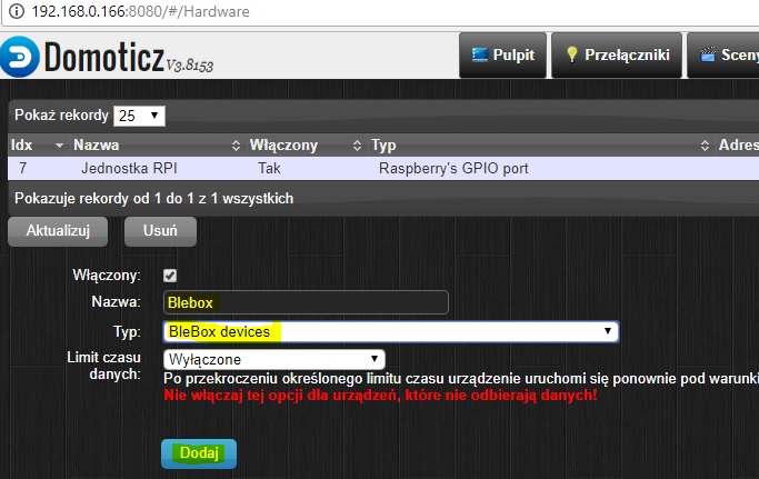- Kolejnym krokiem jest dodanie nowego sprzętu. W tym celu wprowadzamy Nazwę (u nas jest to Blebox) oraz rozwijamy listę „Typ:”, gdzie wybieramy „Blebox Devices” i klikamy ikonę „Dodaj”.